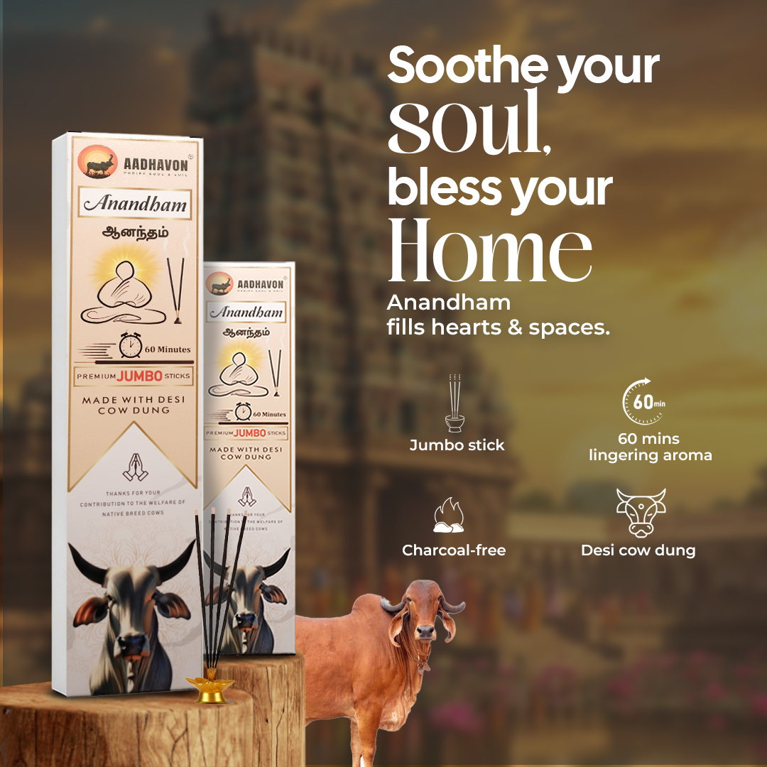 Enjoy a calming, long-lasting fragrance for up to 60 minutes with Anandham jumbo sticks, made from natural ingredients and traditional desi cow dung base. Ideal for pooja, meditation, and creating a peaceful ambience.