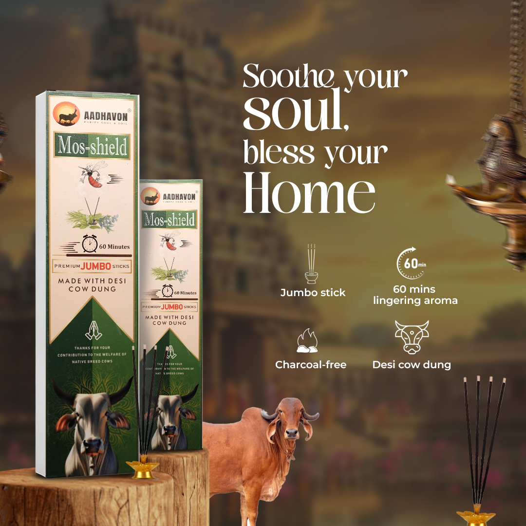 Mos-Shield Premium Jumbo Incense Sticks Natural mosquito-repellent formula Made with organic ingredients and cow dung base Long, steady burning jumbo sticks Helps keep surroundings fresh and insect-free Ideal for indoor and outdoor use Suitable for daily use during evenings and nights