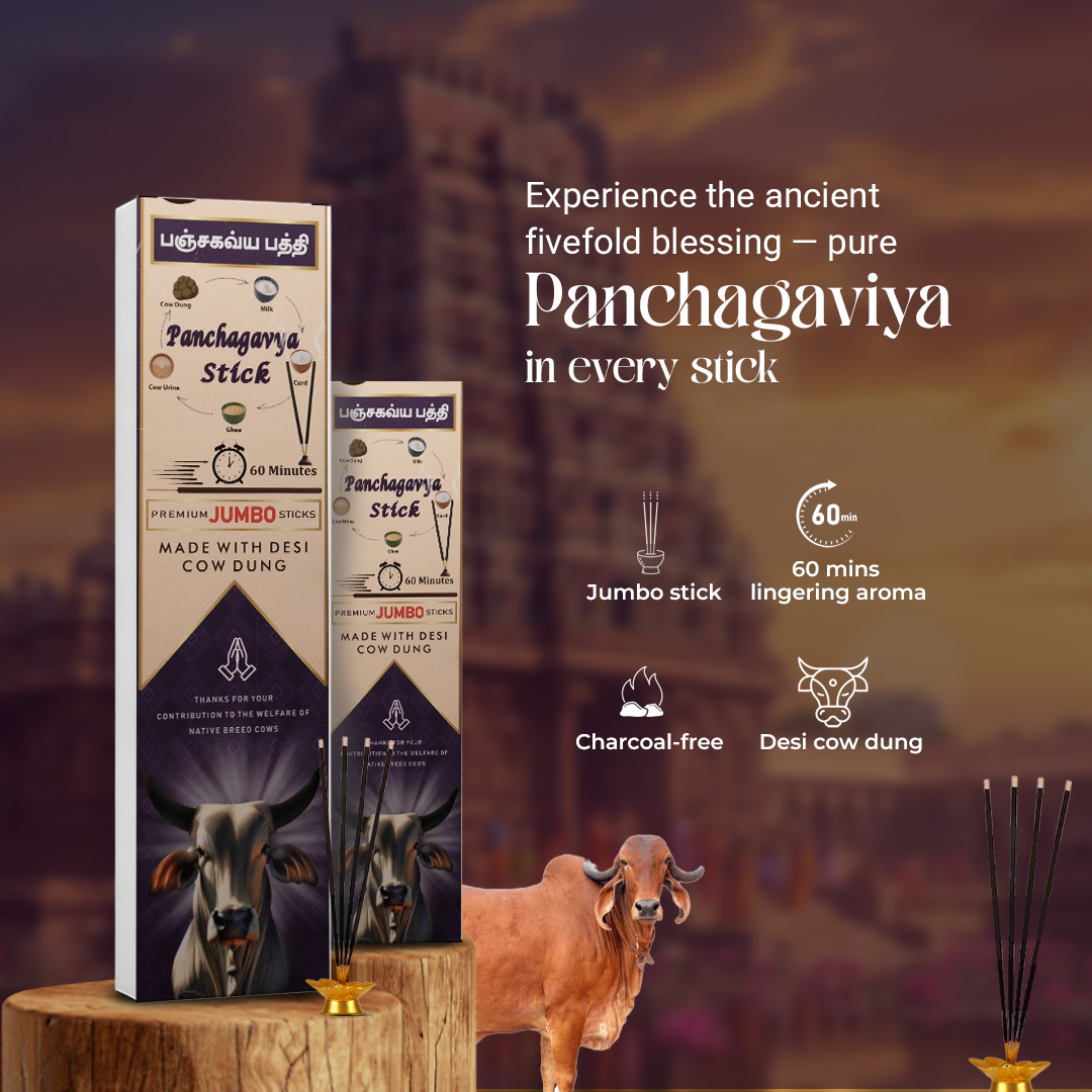 Crafted with traditional Panchagavya ingredients—cow dung, ghee, milk, curd, and cow urine—these jumbo sticks offer a pure, spiritual fragrance that lasts up to 60 minutes, ideal for pooja, meditation, and sacred rituals.